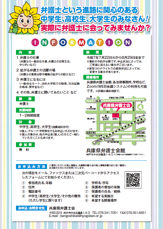 | 申込方法 | フォームからのお申し込み https://ws.formzu.net/fgen/S74794826/ フォームから申し込みされない場合、次の項目をメールbengoshikai@hyogoben.or.jp またはファックス(078-351-6651)にてお知らせください。 ①参加者氏名、年齢 ②住所 ③電話番号 ④中学生/高校生/大学生/その他の属性 (学生に限ります) ⑤学校名・学年 ⑥保護者の参加の有無 ⑦保護者の氏名/続柄 ⑧希望する実施日(第一希望日、第二希望日) ⑨希望する開催場所 |