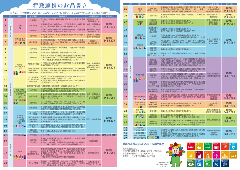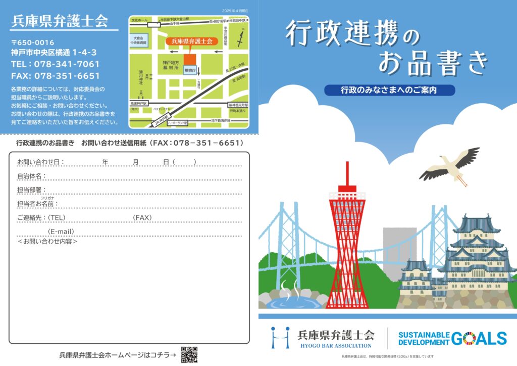 兵庫県弁護士会では、自治体・行政のみなさまとのより深い連携を目指し、同封の冊子「行政連携のお品書き」を発刊いたしました。