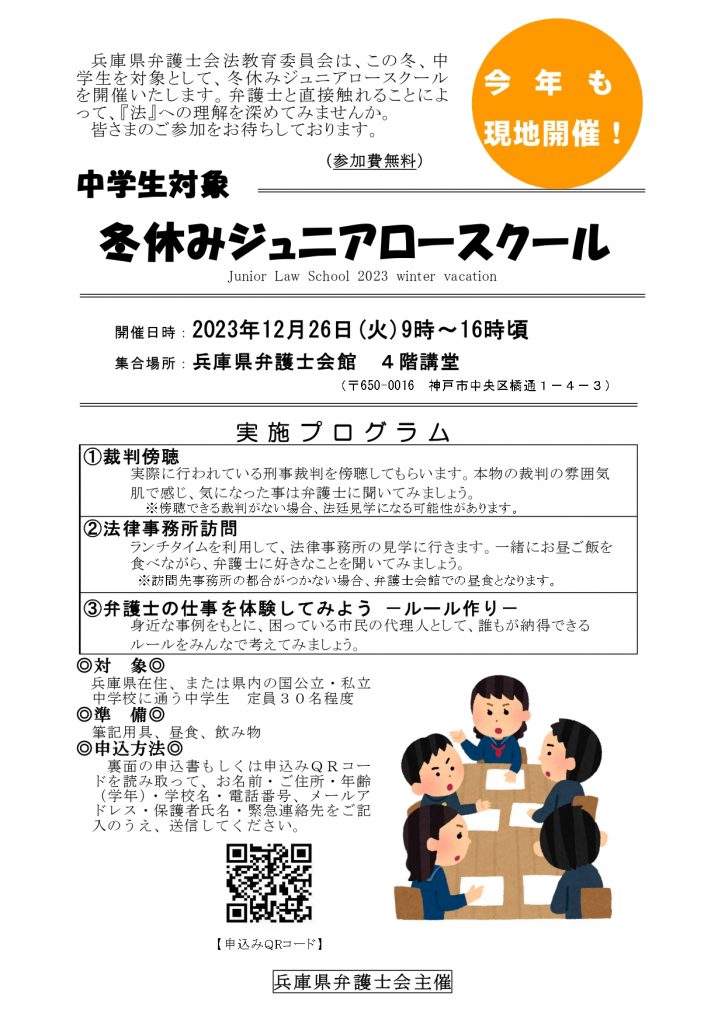 兵庫県弁護士会法教育委員会ではこの冬、中学生を対象として、冬休みジュニアロースクールを開催いたします。