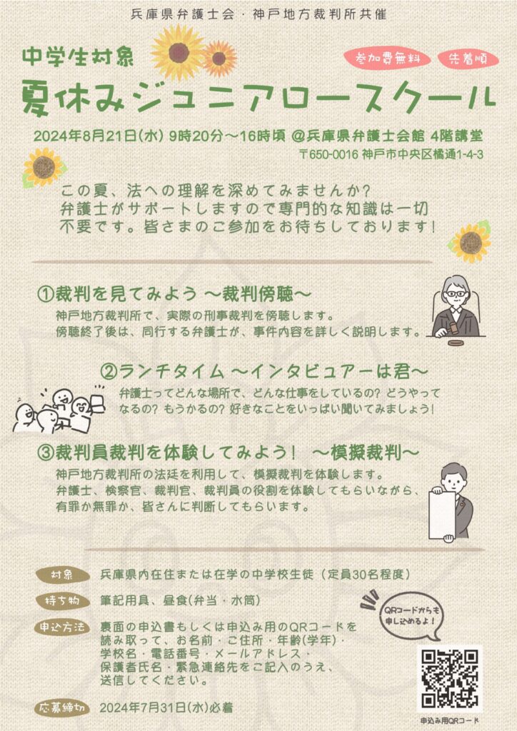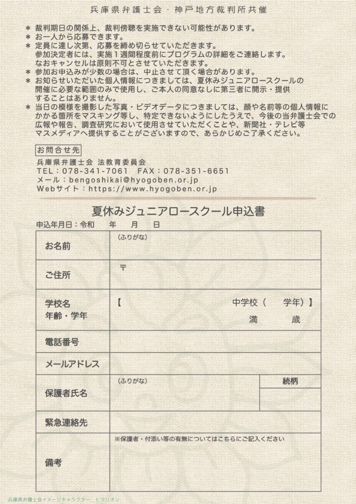 兵庫県弁護士会法教育委員会ではこの夏、中学生を対象として、夏休みジュニアロースクールを開催いたします。
