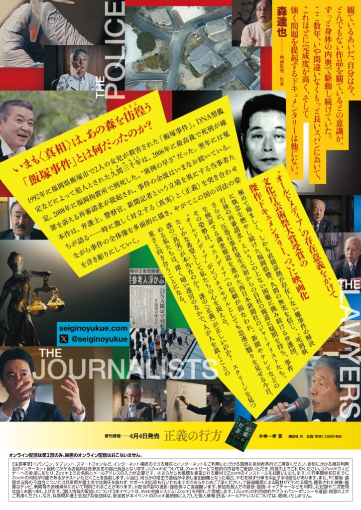 | プログラム | 第1部:午前10時~(開場:午前9時30分予定) ※ 第1部のオンライン配信は実施しません (1) 開会あいさつ (2) 映画「正義の行方」上映 第2部:午後1時30分~(開場:午後1時予定) (1) 報告その1 「日本の死刑制度について考える懇話会」からの提言 日本の死刑制度について考える懇話会事務局長 川村 百合 弁護士(東京弁護士会) (2) 報告その2 「飯塚事件について」 飯塚事件弁護団共同代表 徳田 靖之 弁護士(大分県弁護士会) (3) 座談会 徳田靖之 氏(弁護士・飯塚事件弁護団共同代表) 水谷規男 氏(大阪大学法科大学院教授) 川村百合 氏(弁護士・日本の死刑制度について考える懇話会事務局長) 加藤孔明 氏(当会刑事弁護センター副委員長・再審法改正検討部会座長) (4) 閉会あいさつ |