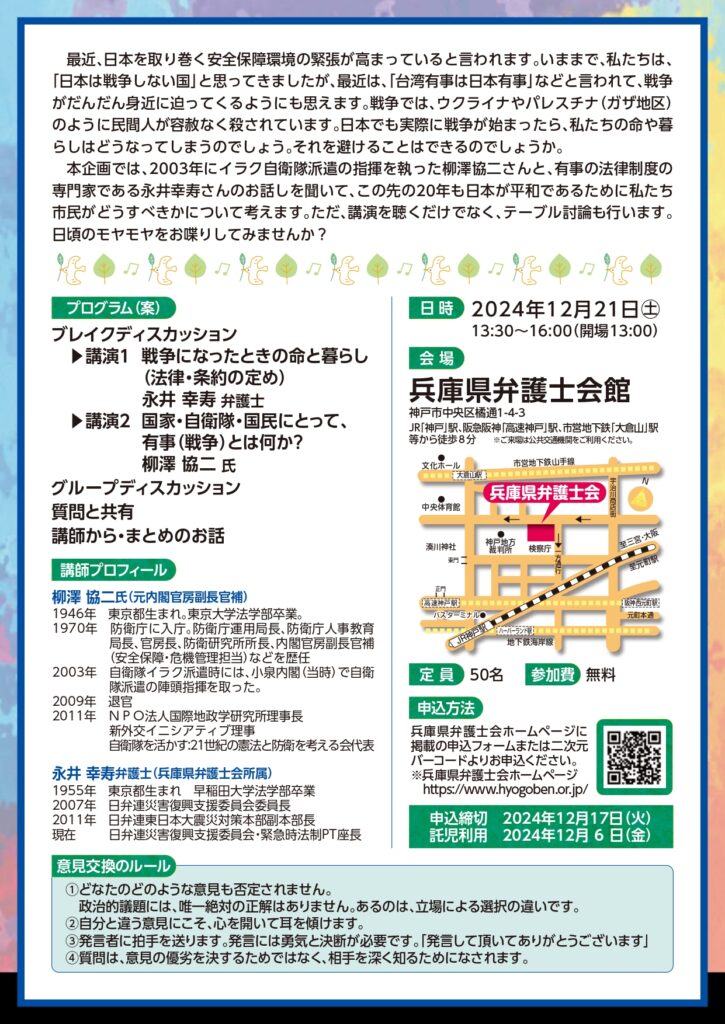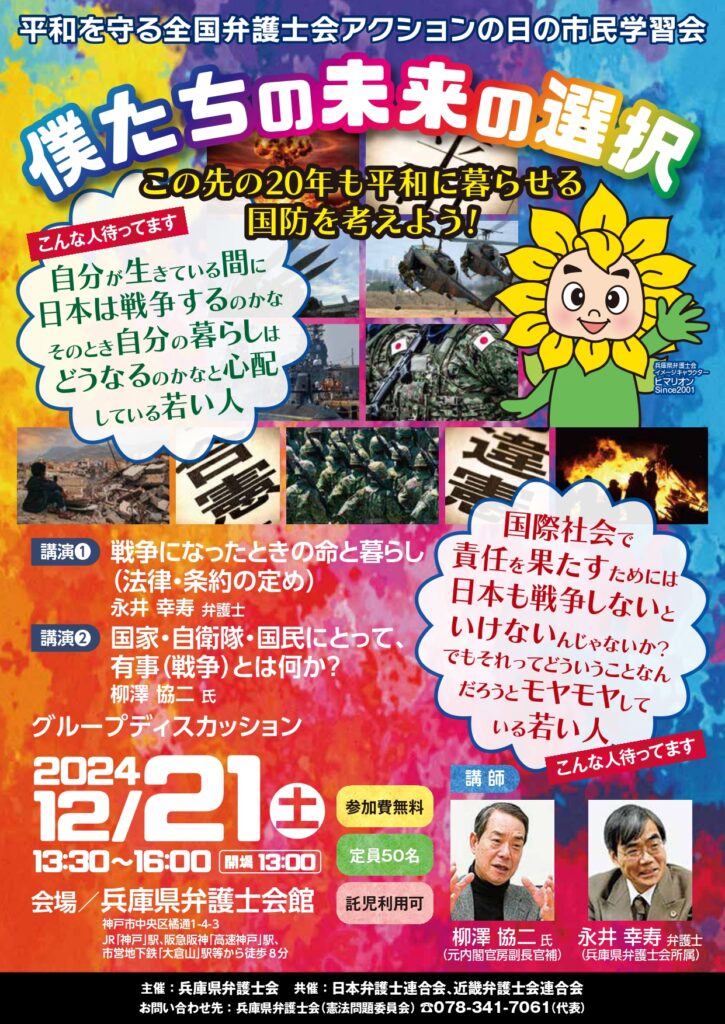 | 講師 | 講演① 永井幸寿弁護士(兵庫県弁護士会所属) 講演② 柳澤協二氏(元内閣官房副長官補) |