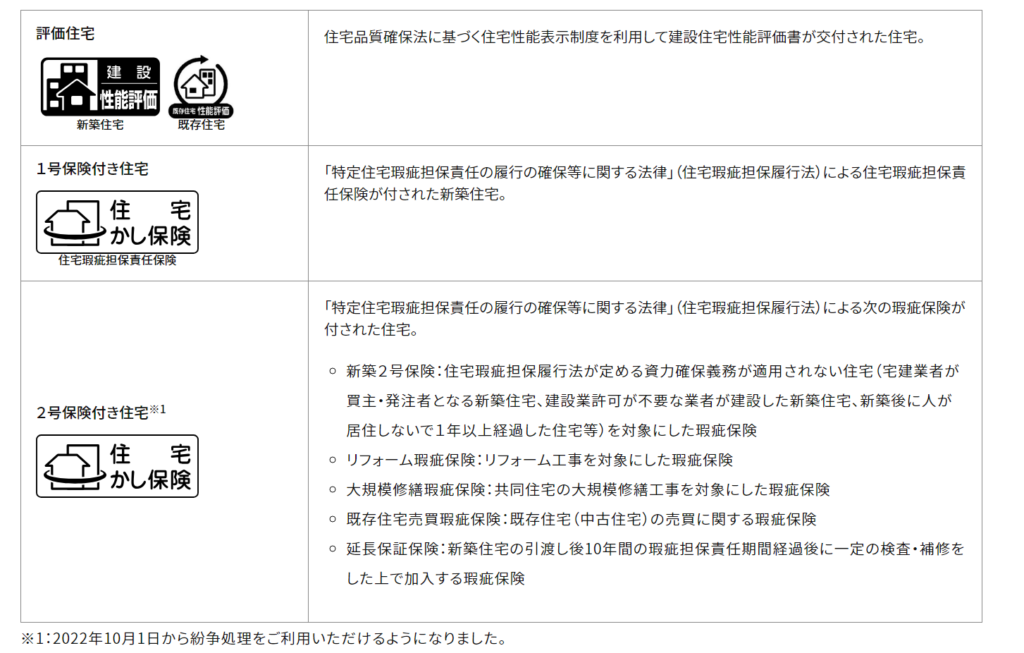 住宅紛争審査会は、下表の評価住宅及び保険付き住宅(1号保険付き住宅及び2号保険付き住宅について、その建設工事の請負契約又は売買契約等に関する紛争処理(あっせん、調停、仲裁)を行っています。