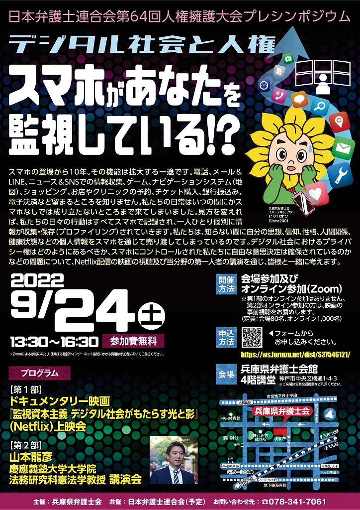 | プログラム(予定) | 【第1部】 ドキュメンタリー映画『監視資本主義 デジタル社会がもたらす光と影』(Netflix)上映会 【第2部】 山本龍彦慶應義塾大学大学院法務研究科憲法学教授 講演会 チラシPDFはこちら |