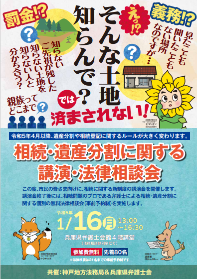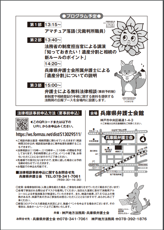 | 共催 | 神戸地方法務局&兵庫県弁護士会 お問合せ先:兵庫県弁護士会TEL 078-341-7061 神戸地方法務局TEL078‒392‒1876 |