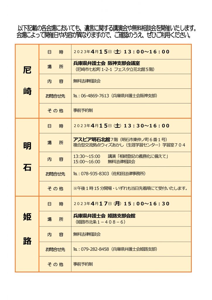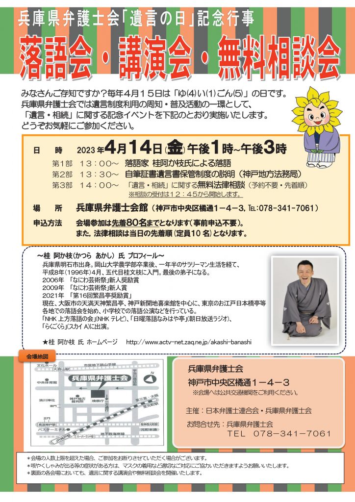 兵庫県弁護士会では遺言制度利用の周知・普及活動の一環として、「遺言・相続」に関する記念イベントを下記のとおり実施いたします。どうぞお気軽にご参加ください。