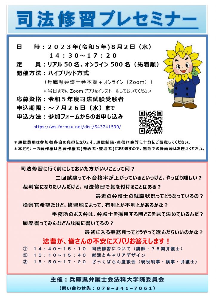 兵庫県弁護士会法科大学院委員会主催の「司法修習プレセミナー」を以下のとおり開催いたします。