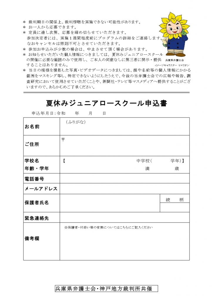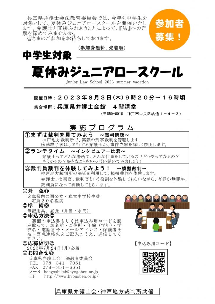兵庫県弁護士会法教育委員会ではこの夏、中学生を対象として,夏休みジュニアロースクールを開催いたします。