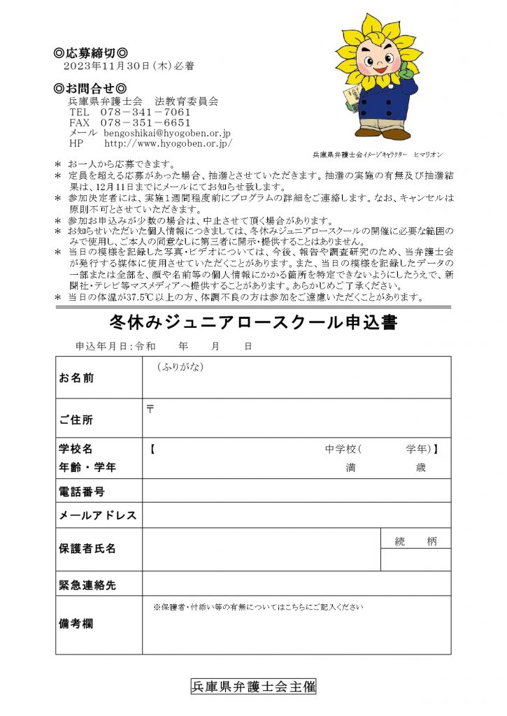 兵庫県弁護士会法教育委員会ではこの冬、中学生を対象として、冬休みジュニアロースクールを開催いたします。