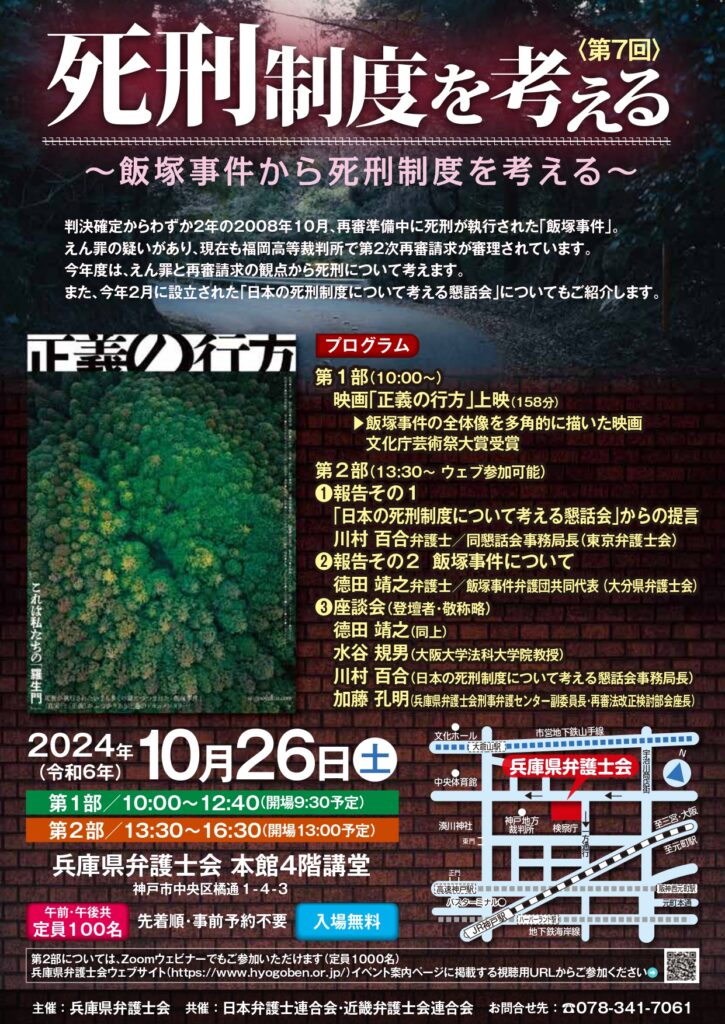 | プログラム | 第1部:午前10時~(開場:午前9時30分予定) ※ 第1部のオンライン配信は実施しません (1) 開会あいさつ (2) 映画「正義の行方」上映 第2部:午後1時30分~(開場:午後1時予定) (1) 報告その1 「日本の死刑制度について考える懇話会」からの提言 日本の死刑制度について考える懇話会事務局長 川村 百合 弁護士(東京弁護士会) (2) 報告その2 「飯塚事件について」 飯塚事件弁護団共同代表 徳田 靖之 弁護士(大分県弁護士会) (3) 座談会 徳田靖之 氏(弁護士・飯塚事件弁護団共同代表) 水谷規男 氏(大阪大学法科大学院教授) 川村百合 氏(弁護士・日本の死刑制度について考える懇話会事務局長) 加藤孔明 氏(当会刑事弁護センター副委員長・再審法改正検討部会座長) (4) 閉会あいさつ |
