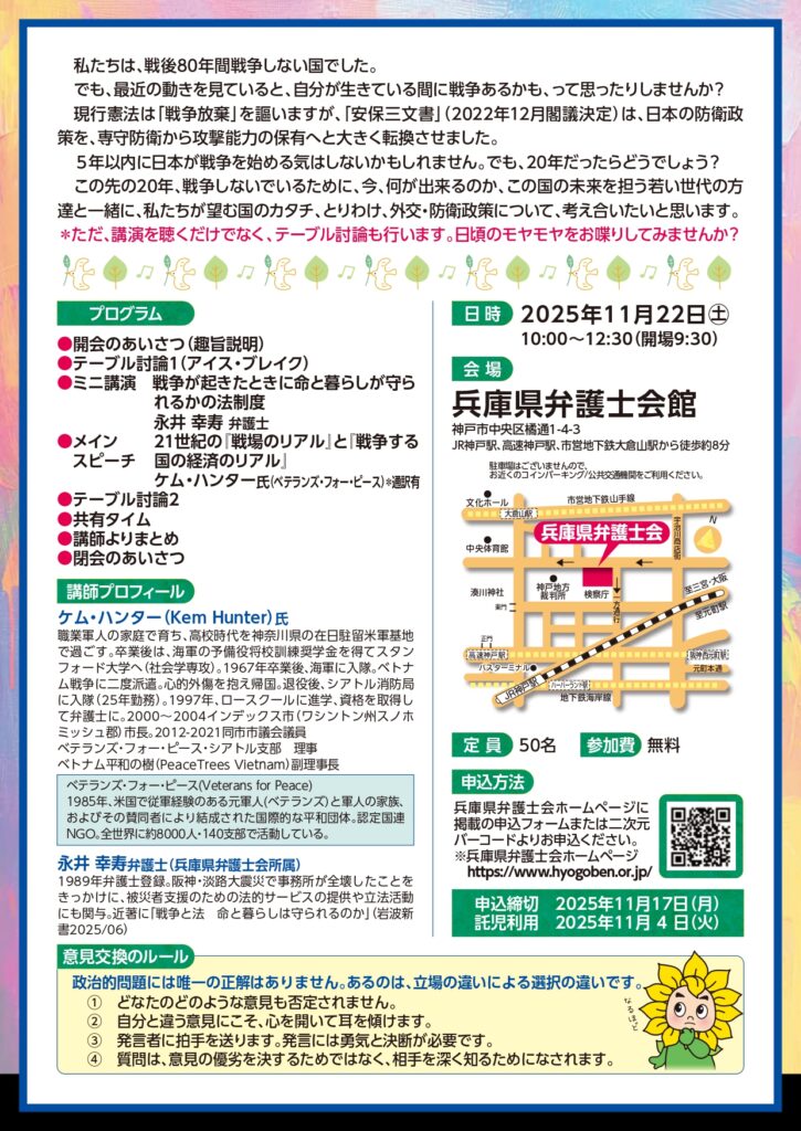 内容 | ・テーブル討論1(アイス・ブレイク) ・ミニ講演「戦争が起きたときに命と暮らしが守られるかの法制度」 ・メインスピーチ「21世紀の『戦場のリアル』と『戦争する国の経済のリアル』」 ・テーブル討論2 ・共有タイム ・講師よりまとめ |