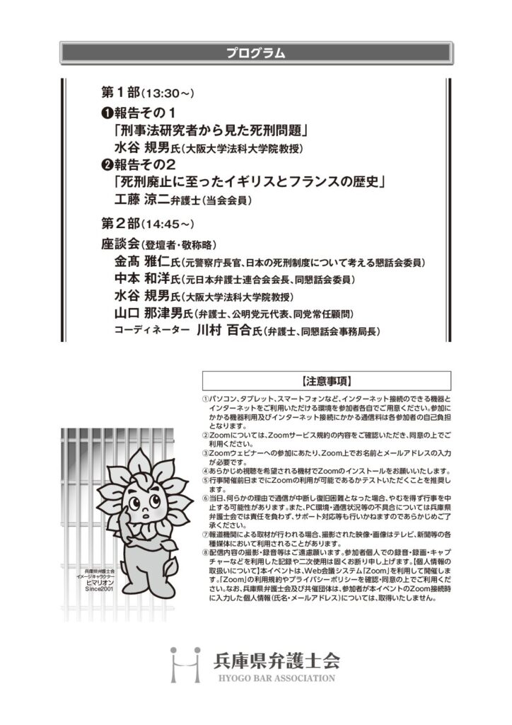 | プログラム | 第1部(13:30~) 報告その1「刑事法研究者から見た死刑問題」 水谷 規男 氏(大阪大学法科大学院教授) 報告その2「死刑廃止に至ったイギリスとフランスの歴史」 工藤 涼二 氏(兵庫県弁護士会会員) 第2部(14:45~) 座談会(登壇者・敬称略) パネリスト 金髙 雅仁 氏 (元警察庁長官、日本の死刑制度について考える懇話会委員) 中本 和洋 氏 (元日本弁護士連合会会長、弁護士、同懇話会委員) 水谷 規男 氏 (大阪大学法科大学院教授) 山口 那津男 氏(弁護士、公明党元代表、同党常任顧問) コーディネーター 川村 百合 氏 (弁護士、同懇話会事務局長) |