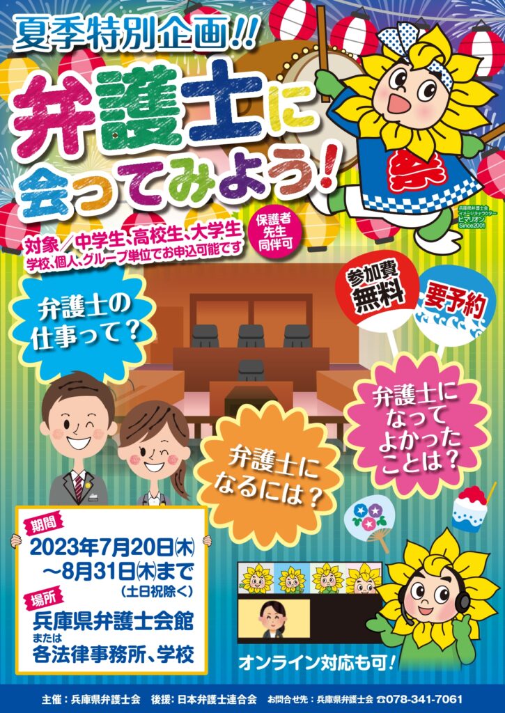 兵庫県下の中学生・高校生・大学生・専門学校生を対象に、弁護士の仕事の内容を伝え、その存在を身近に感じてもらい、将来の職業選択の参考としていただくことを目的として、夏季特別企画「弁護士に会ってみよう!」を実施いたします。