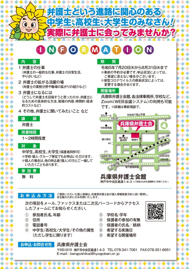 | 申込方法 | フォームからのお申し込み https://ws.formzu.net/dist/S74794826/ フォームから申し込みされない場合、次の項目をメールbengoshikai@hyogoben.or.jp またはファックス(078-351-6651)にてお知らせください。 ①参加者氏名、年齢 ②住所 ③電話番号 ④中学生/高校生/大学生/その他の属性 (学生に限ります) ⑤学校名・学年 ⑥保護者の参加の有無 ⑦保護者の氏名/続柄 ⑧希望する実施日(第一希望日、第二希望日) ⑨希望する開催場所 |