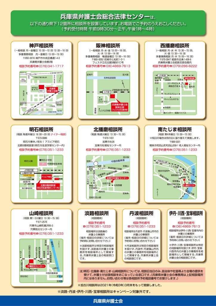 | お問合せ先 | 兵庫県弁護士会総合法律センター 電話:078-341-1717 ※ご用件を「2回目減額キャンペーン」とお伝え下さい。 |